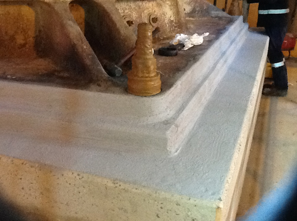 Problem: Primary crusher is mounted to reinforced concrete foundation via four stud bolts, steel packing and an epoxy grout with visual motion between the lower shell main frame and the grout foundation.