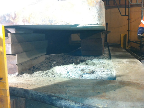 Solution: To jack up existing crusher, remove existing hold down bolts, remove grout and part of reinforced concrete foundation to a sound base, install and set K-screws to strategic locations under crusher frame, lower crusher onto K-screws & level, pour new Epoxy foundation to crusher after realignment completed, install new hold down bolts and tension to requirements.