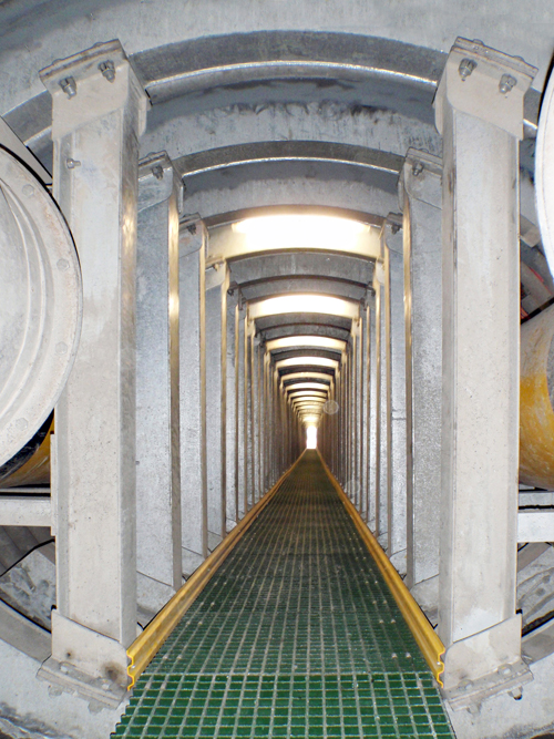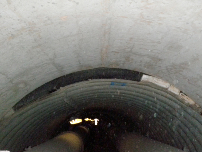 Problem: Over time, the corrugated sheeting walls forming the 2.4m Dia., 66m long Access Tunnel from the Feed Conveyer to the outer edge of the stockpile had become distorted by +300mm in places due to loading and movement of overhead traffic. Untreated, the tunnel walls would eventually weaken to the point of collapse rendering the tunnel inaccessible and/or seriously harming or causing death to any person within the tunnel.